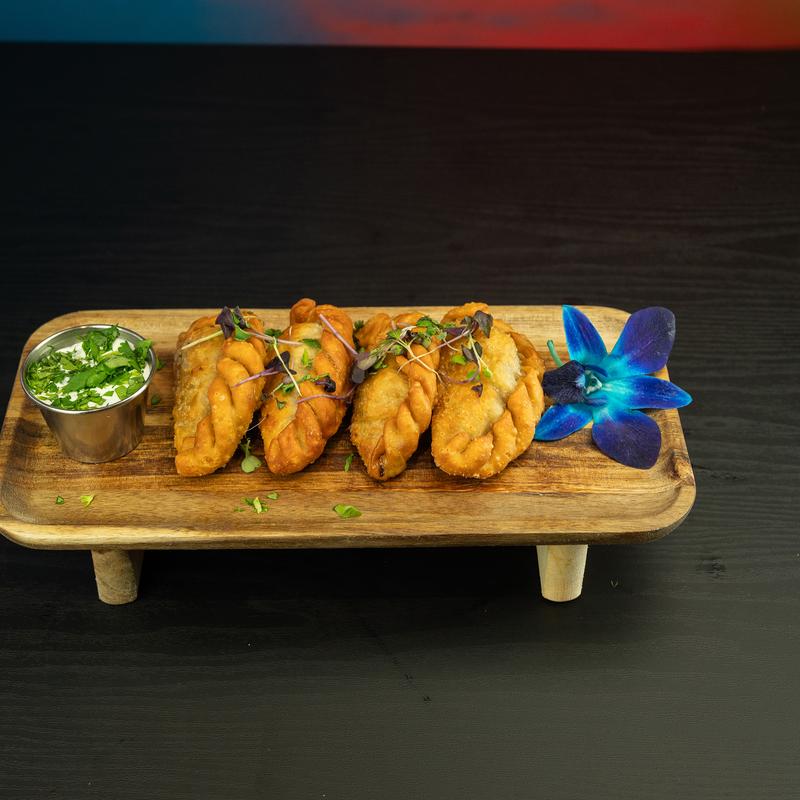 Two beef & cheese and two chicken & cheese hand rolled empanadas. Served with house made cilantro lime crema.
