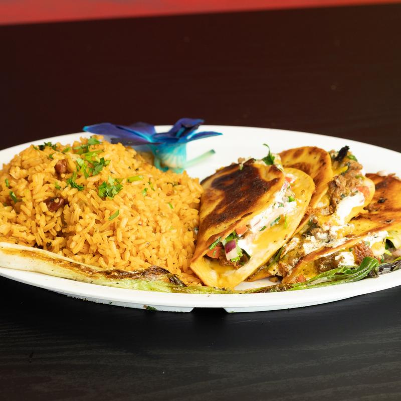 Slow-cooked stewed beef, melty cheese, onion, cilantro, and house crema. Sided with consommé and lime.