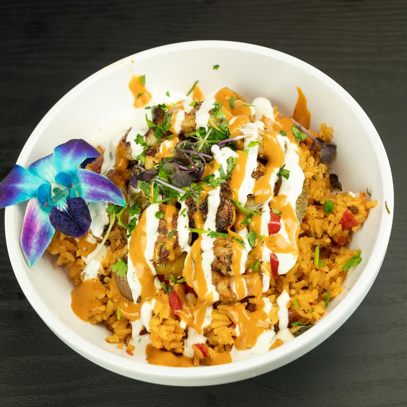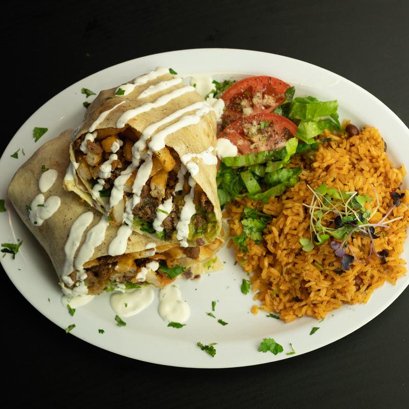 Grilled cajun shrimp yellow rice and beans, lettuce, pico, guacamole, cheese. Sided with a small salad.