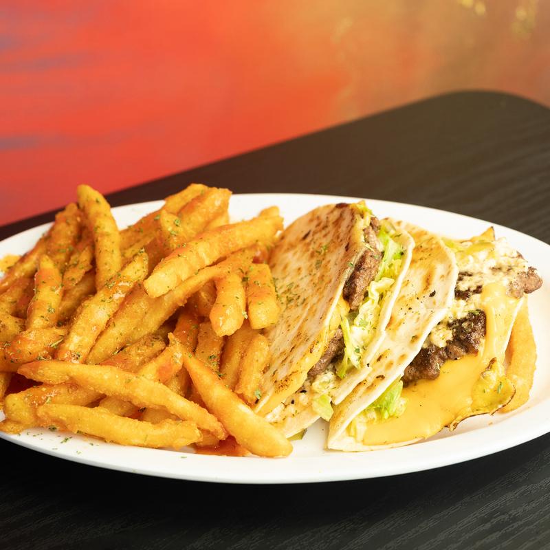 Two smashburger tacos on flour tortillas with American cheese, house mac sauce lettuce pickles. Sided with hot honey fries. (Not sided with rice).