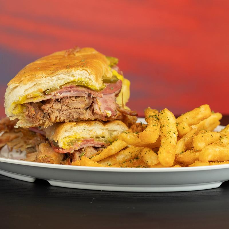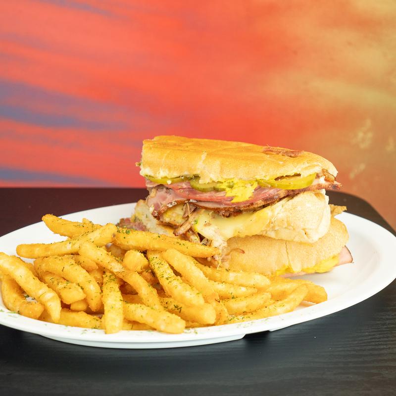 Slow cooked pork, ham, salami, yellow mustard, Swiss & pickles. Sided with fries.